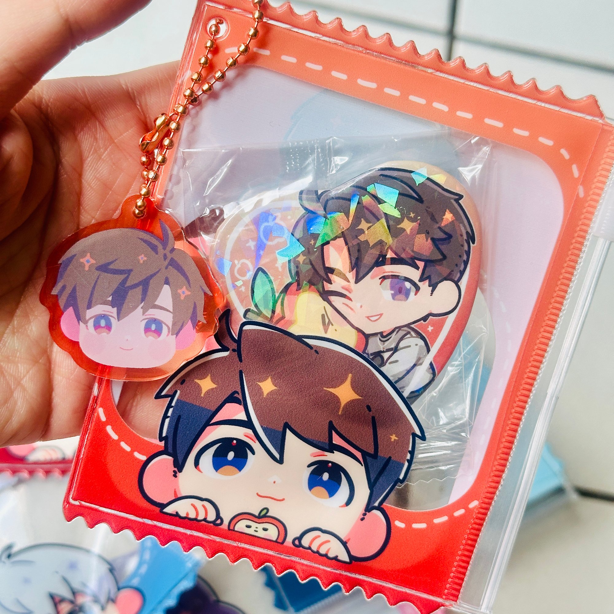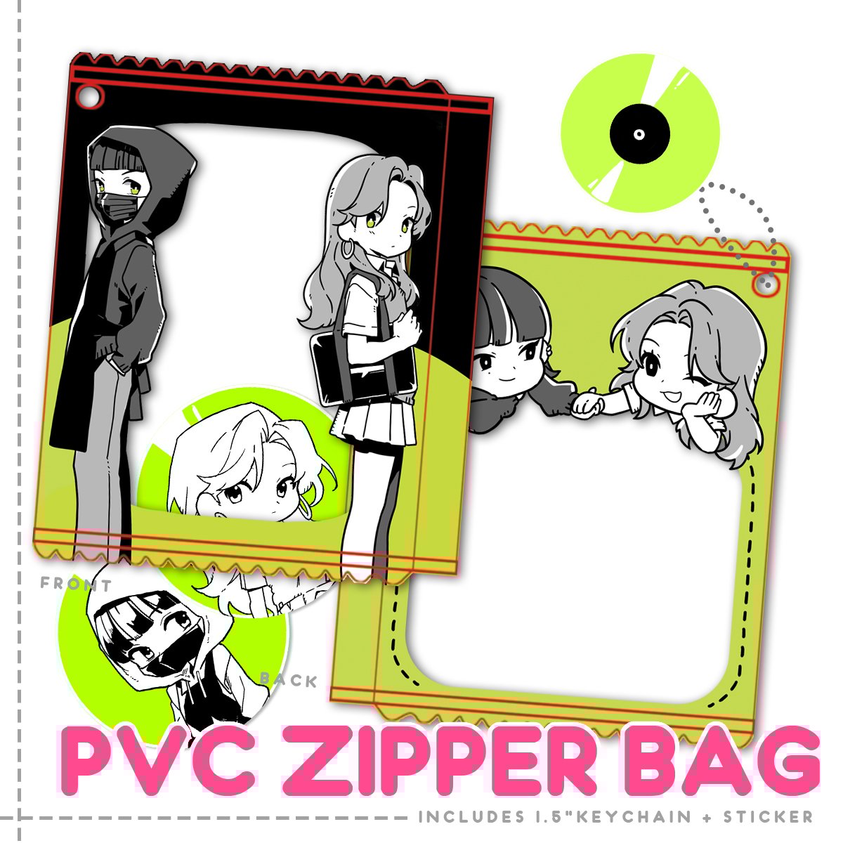 PVC Zipper bag to show off your character merch or use it as an everyday pouch! each bag includes a 1.5" keychain + circle card with back to back print of Aya/Mitsuki