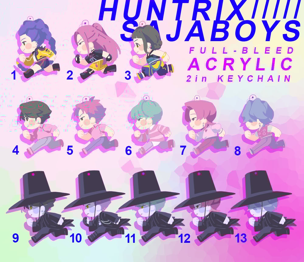 Full-Bleed acrylic charm with a colored loop chain to match the character.
